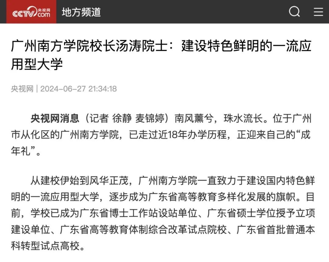 近日,广州南方学院校长汤涛院士、副校长曹广福教授接受央视网记者专访,全面展示我校在应用型人才培养方面的举措与成效,畅谈国内特色鲜明的一流应用型大学的建设之路。该报道于6月27日在央视网客户端发布,以下全文转发。