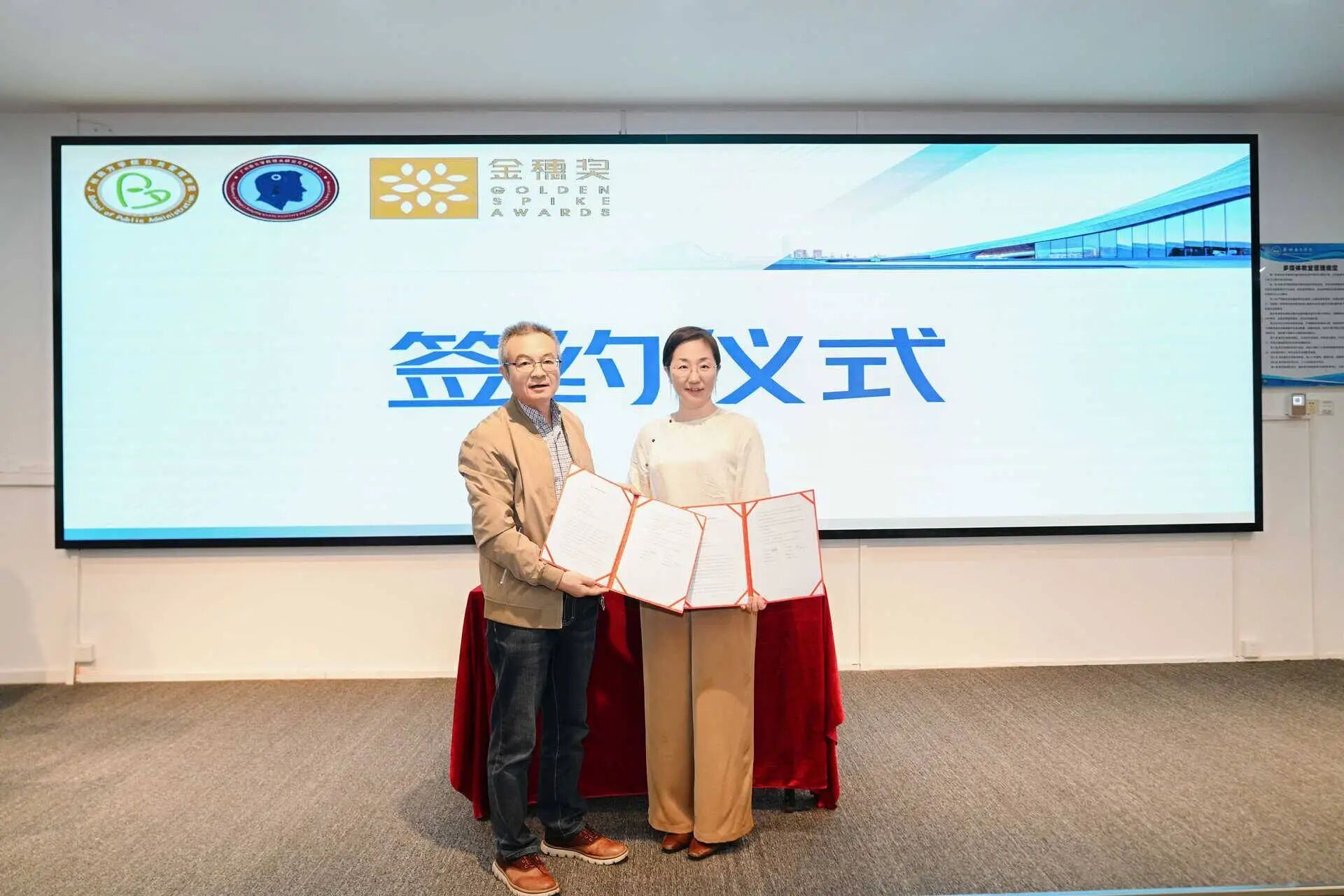 致辞后,进行了本次活动的重点环节——现场举行了广州南方学院公共管理学院与桂林长发小寨博物馆有限公司的校企合作签约仪式。陈天祥院长与贾娜女士共同签署协议,标志着双方合作正式启动。