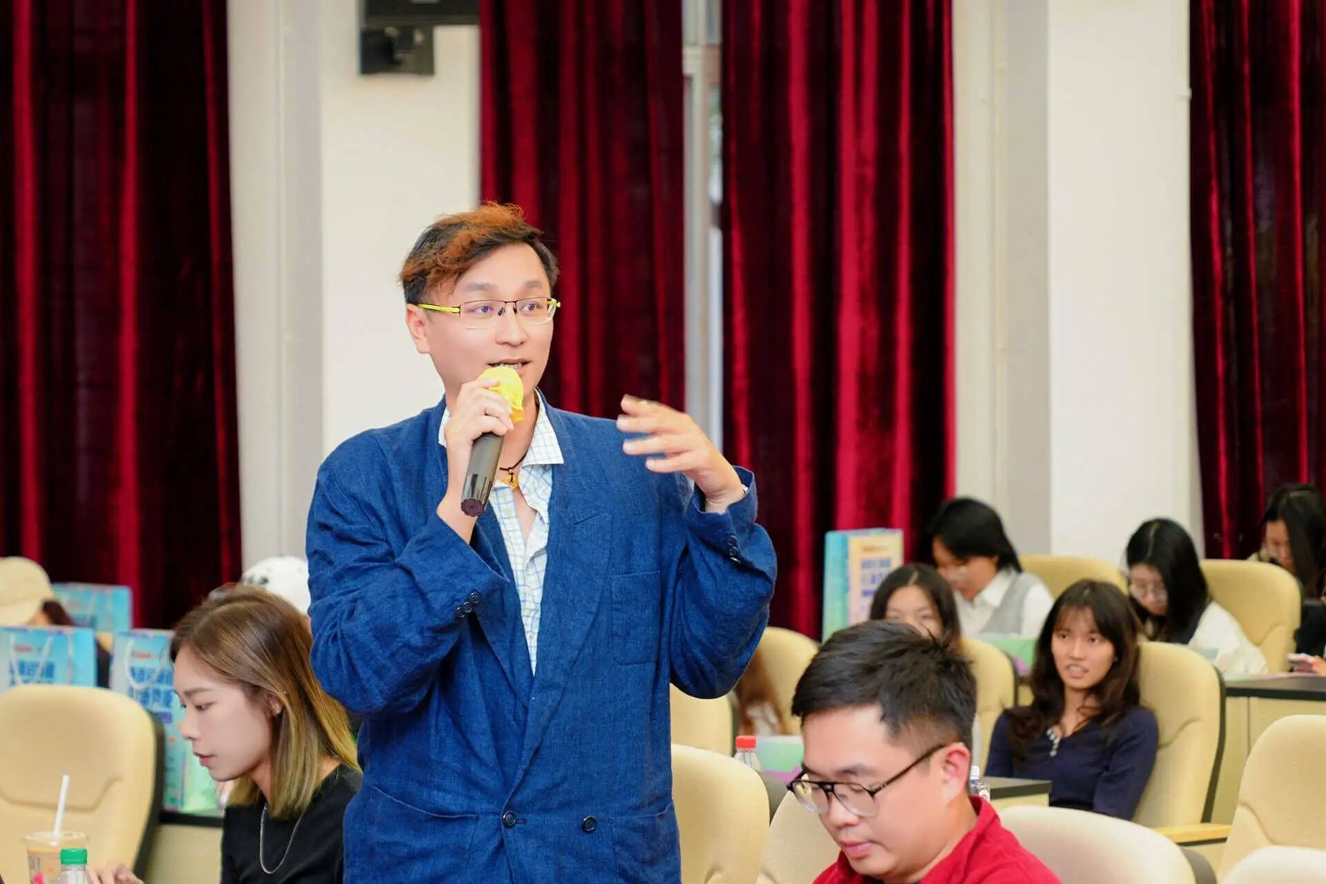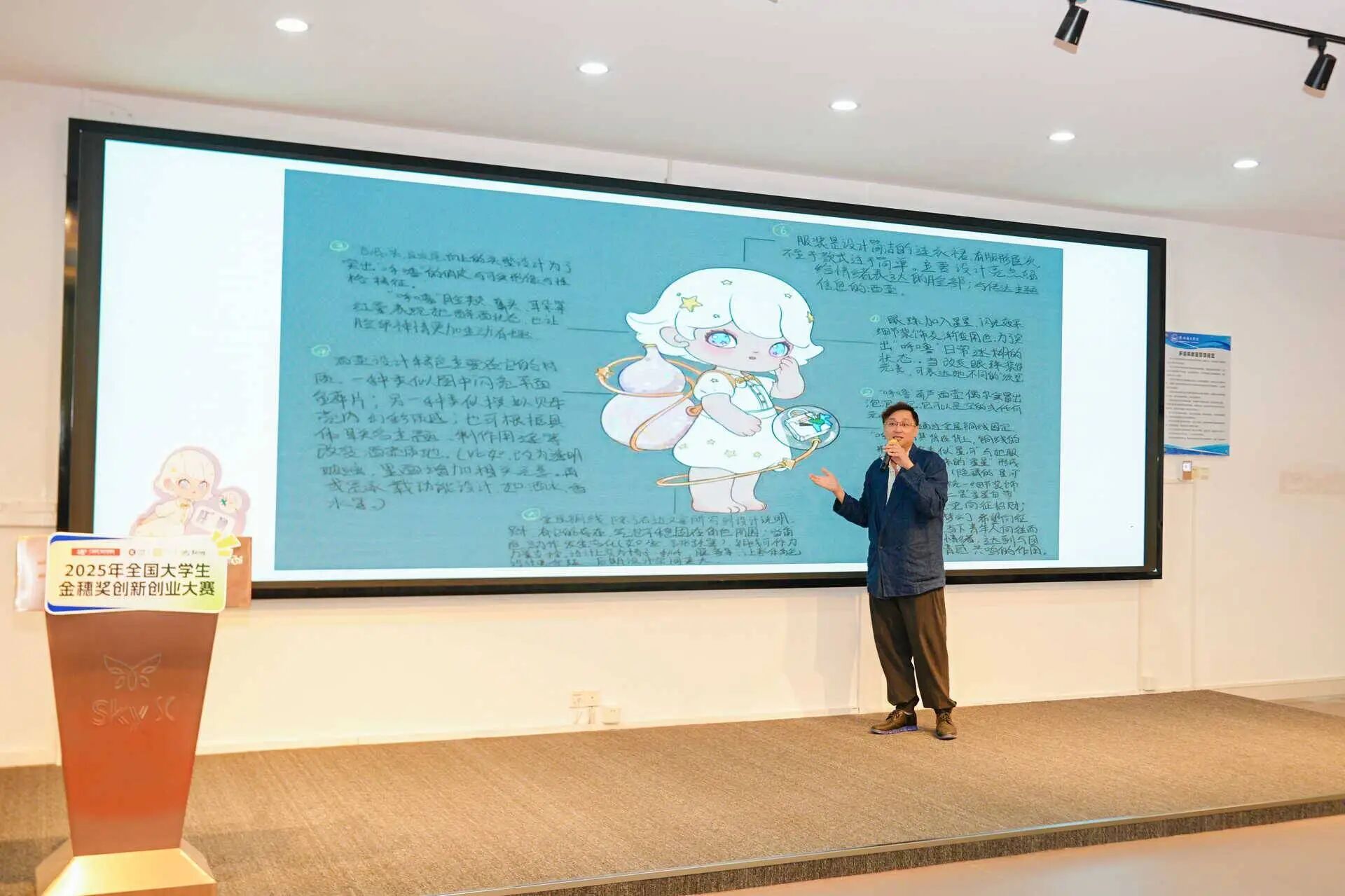 可友可吾(广州)文化有限公司主理人邝康杰先生从IP“呼噜”的玄学设计理念出发解读了“醺梦星河·万物皆可造”的命题内涵,鼓励学生发挥创意,并现场解答设计相关问题。