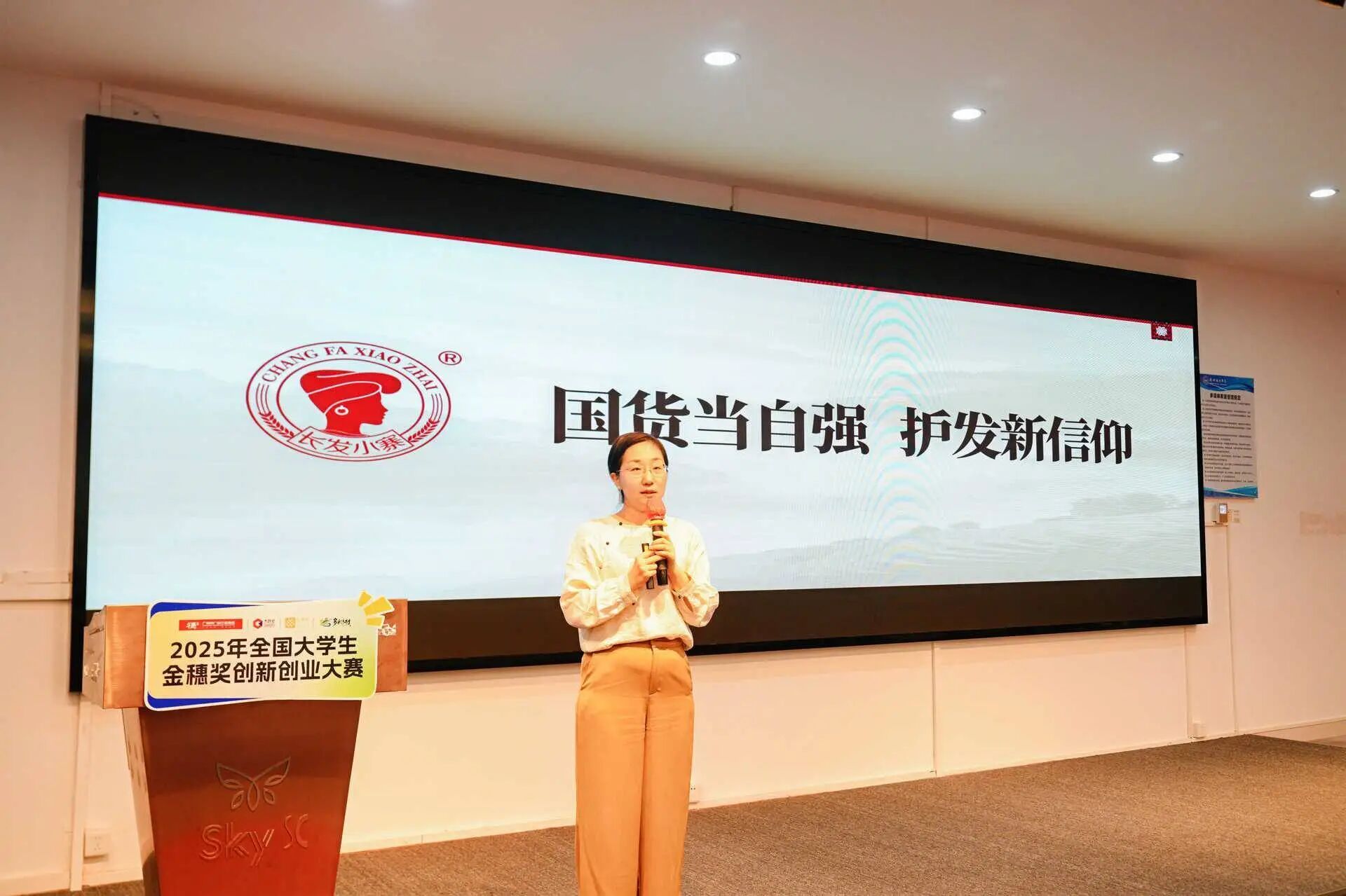 桂林长发小寨博物馆有限公司副总经理贾娜女士介绍,公司依托长发村独特的文化资源,以“国货当自强,护发新信仰”为理念,介绍品牌文化、产品优势及“大学生创业、乡村振兴营销类”两大命题。